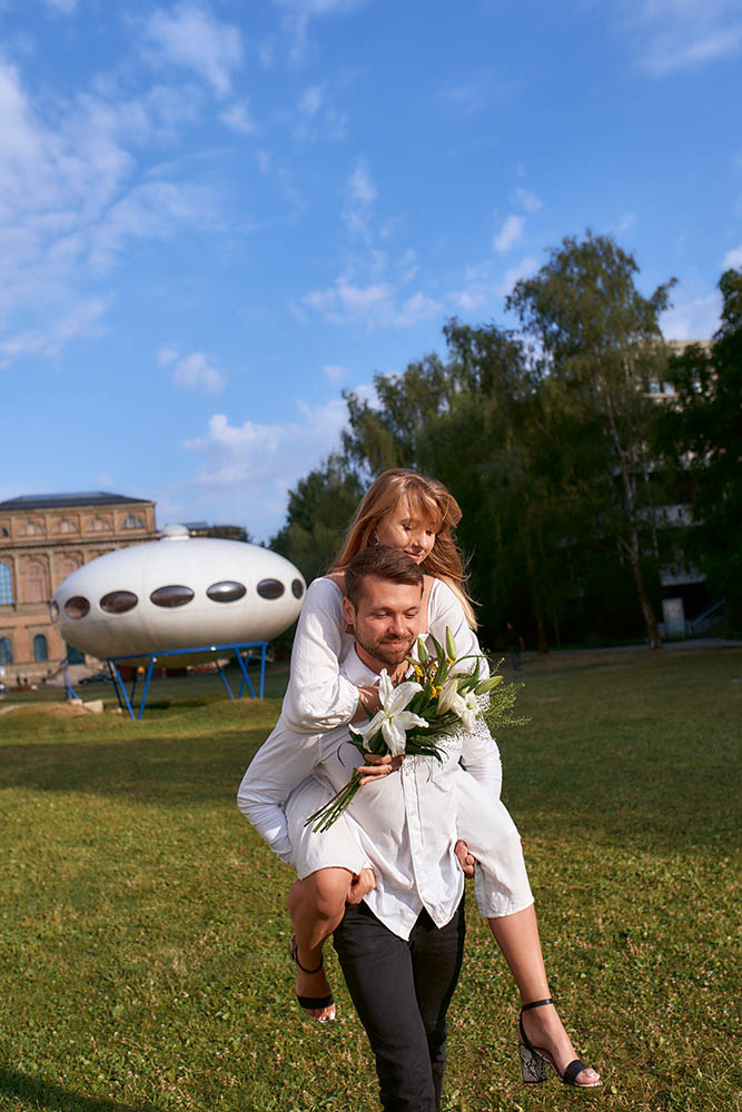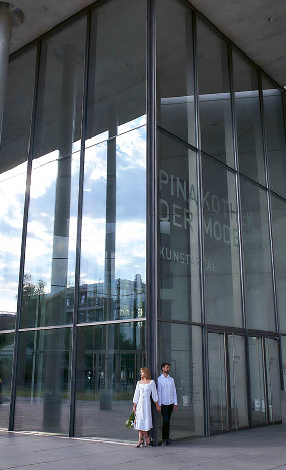 Als nächstes zogen wir weiter zum Museum der Moderne und zum Museum Brandhorst. Die modernen Fassaden und die künstlerischen Elemente boten eine eindrucksvolle Hintergrundkulisse für das Brautpaar. Die klaren Linien, lebendigen Farben und abstrakten Formen der Gebäude spiegelten die moderne und künstlerische Seite der Hochzeit wider. Die Bilder strahlten eine avantgardistische Ästhetik aus.