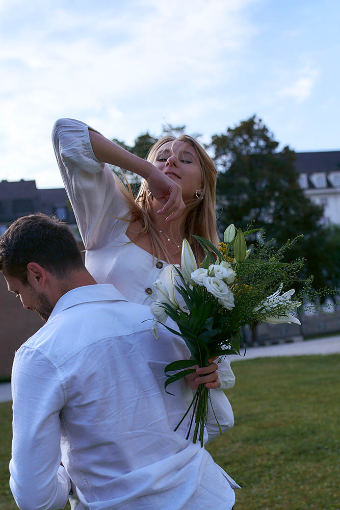 Für das urban inspirierte Hochzeits-Fotoshooting haben wir uns für München als perfekte Kulisse entschieden. Unser erstes Ziel war der Königsplatz, ein historischer Ort mit beeindruckender Architektur. Das Brautpaar posierte vor den monumentalen Säulen und genoss die romantische Atmosphäre des Platzes. Die majestätische Kulisse verlieh den Bildern eine zeitlose Eleganz.
