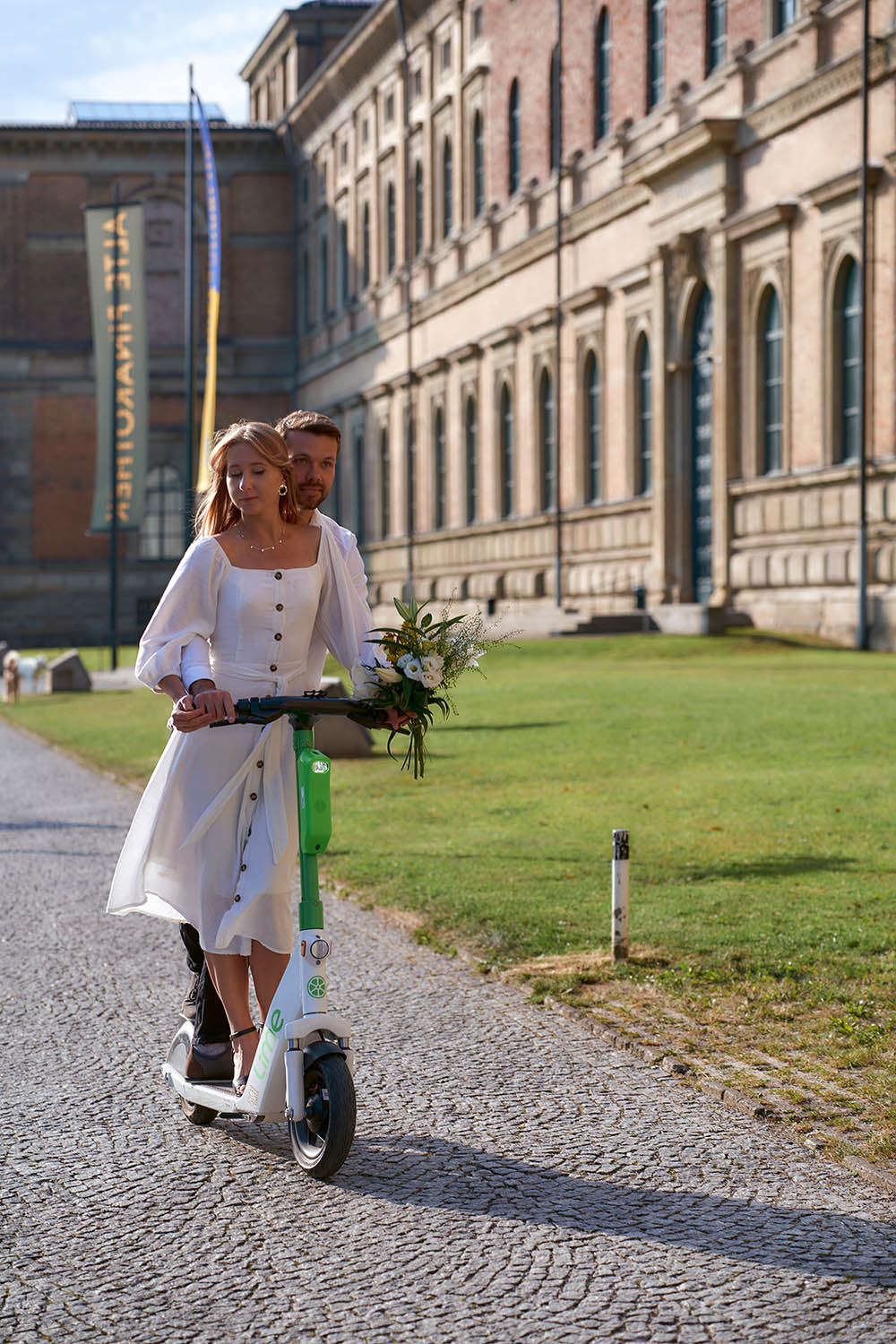 Um das urbane Flair von München noch intensiver einzufangen, entschieden wir uns für eine Fahrt mit dem Roller durch die belebten Straßen der Stadt. Das Brautpaar ließ sich von der Energie und dem Puls der Stadt inspirieren. Wir hielten ihre fröhlichen Momente auf dem Roller fest, während sie an Cafés, Geschäften und interessanten urbanen Hintergründen vorbeifuhren. Die Bilder strahlten Abenteuerlust und Lebensfreude aus.